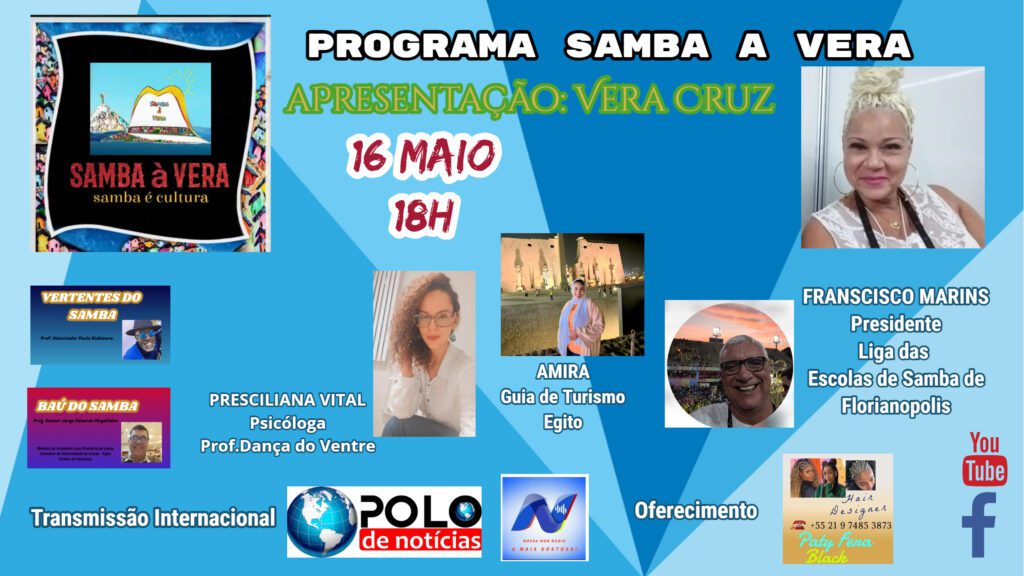 Thursday, May 16th, starting at 6pm, the Samba à Vera Tv Show will have the pleasure of welcoming Presciliana Vital-Psychologist and Belly Dance teacher, who will talk to us about the common point between Psychology and dance; Francisco Marins – President of the League of Samba Schools of Florianópolis and directly from Egypt Amira Khaled, graduated in Portuguese and tour guide.