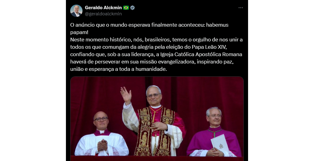 A eleição do novo papa Leão XIV gerou reações no Brasil. O presidente Luiz Inácio Lula da Silva e o presidente em exercício Geraldo Alckmin parabenizaram a escolha. Em uma publicação compartilhada pelo Governo Federal, foi declarado: “Habemus um novo Papa! Que ele seja guia de justiça social e promotor da paz, da redução da pobreza, do combate à fome e de um mundo mais humano. Por aqui seguimos trabalhando todos os dias para que esses objetivos também se realizem no Brasil. Habemus esperança, Habemus compromisso!”. Geraldo Alckmin ressaltou o momento histórico e a importância da “missão evangelizadora” da Igreja Católica sob a nova liderança, expressando o orgulho dos brasileiros em compartilhar a alegria da eleição que inspira “paz, união e esperança a toda a humanidade”.