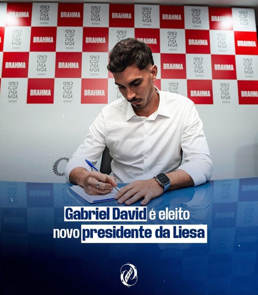 Dans la nuit de ce jeudi 25 avril 2024, après une séance plénière, Gabriel David a été acclamé comme nouveau président de LIESA, la Ligue des Écoles de Samba du Groupe Spécial qui défile à Marques de Sapucaí, à Rio de Janeiro – Brésil . Son mandat durera 3 ans.