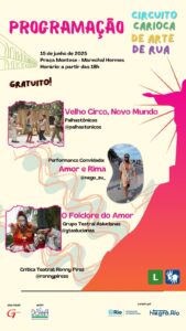 Com palhaçaria e muito amor envolvido, o “Circuito Carioca de Arte de Rua” celebra o Mês dos Namorados. A próxima edição do projeto, que tem ocupado praças públicas de diversos lugares do Rio de Janeiro, acontece neste domingo (15), a partir das 18h, na Praça Montese (Quinze de Novembro), em Marechal Hermes, com uma programação gratuita e voltada para toda a família. A programação conta com espetáculos bem-humorados inspirados na literatura e na cultura popular e uma performance musical de rap que traz o amor como tema central.