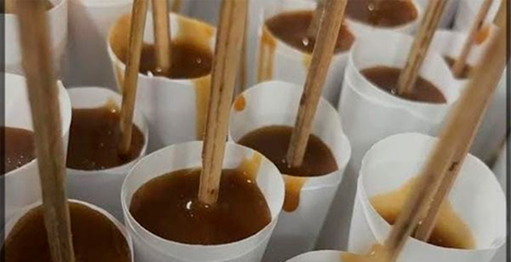 Feito isso, Dona Naninha colocou a calda, esperou um pouquinho e colocou os palitos. Pronto! Os pirulitos já estavam prontos, era só aguardar outro dia e sair para vendê-los.