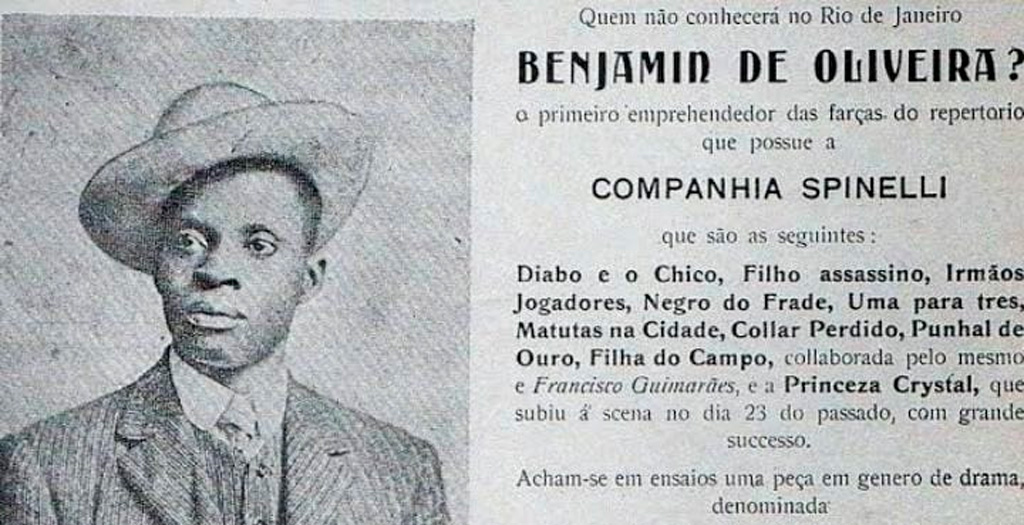 Benjamim de Oliveira, negro, criança ainda, quando a Lei Áurea (1888) imperava em território nacional, abandonou o lar aos 12 anos, Negro forro, sua alforria e de seus irmãos veio após nascerem. Seu pai, trabalhava buscando escravos fugitivos, capitão do mato como eram tratados os que deixavam o trabalho da fazenda para terem liberdade.