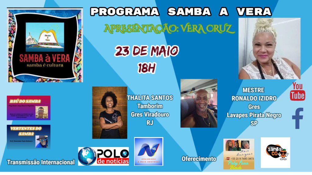 Ce jeudi 23 mai 2024, l’émission télévisée Samba à Vera aura le plaisir d’accueillir Thalita Santos, le batteur le plus célèbre du Vila Isabel, vainqueur du défilé du carnaval de Rio de Janeiro cette année, et Mestre Ronaldo Izidro, maître de la batterie de Rio de Janeiro qui brille devant les tambours du Pirate Noir Gres Lavapes de São Paulo.