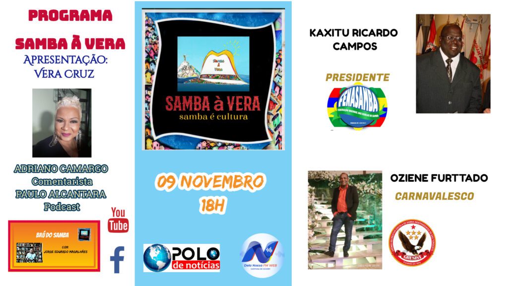 Le 9 novembre 2023, l’émission télévisée Samba à Vera, déjà en préparation pour le Carnaval 2024, a le plaisir d’inviter la révélation du Carnaval de Vitória – Espírito Santo, le compositeur de samba de l’École Indépendante de Samba de São Torquato – Oziene Furttado, et le producteur culturel et grand activiste de la Samba, président de la Fédération Nationale des Écoles de Samba – FENASAMBA, Kaxitu Ricardo Campos.