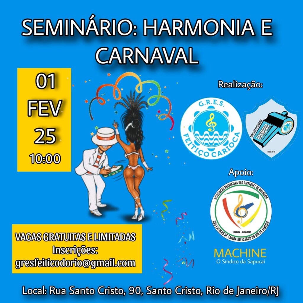 O GRES FEITIÇO CARIOCA e sua DIREÇÃO GERAL DE HARMONIA (@lukasmatheus01 // @harmoniafeiticeira ) realizarão, no próximo sábado , dia 01 de fevereiro de 2025, na Quadra da agremiação – Rua Santo Cristo, 90, Santo Cristo, Rio de Janeiro/RJ, às 10:00, o Seminário: Harmonia e Carnaval, com a participação de grandes nomes do Carnaval Carioca, para discutir temas relevantes do Segmento “Harmonia” no Carnaval Carioca.