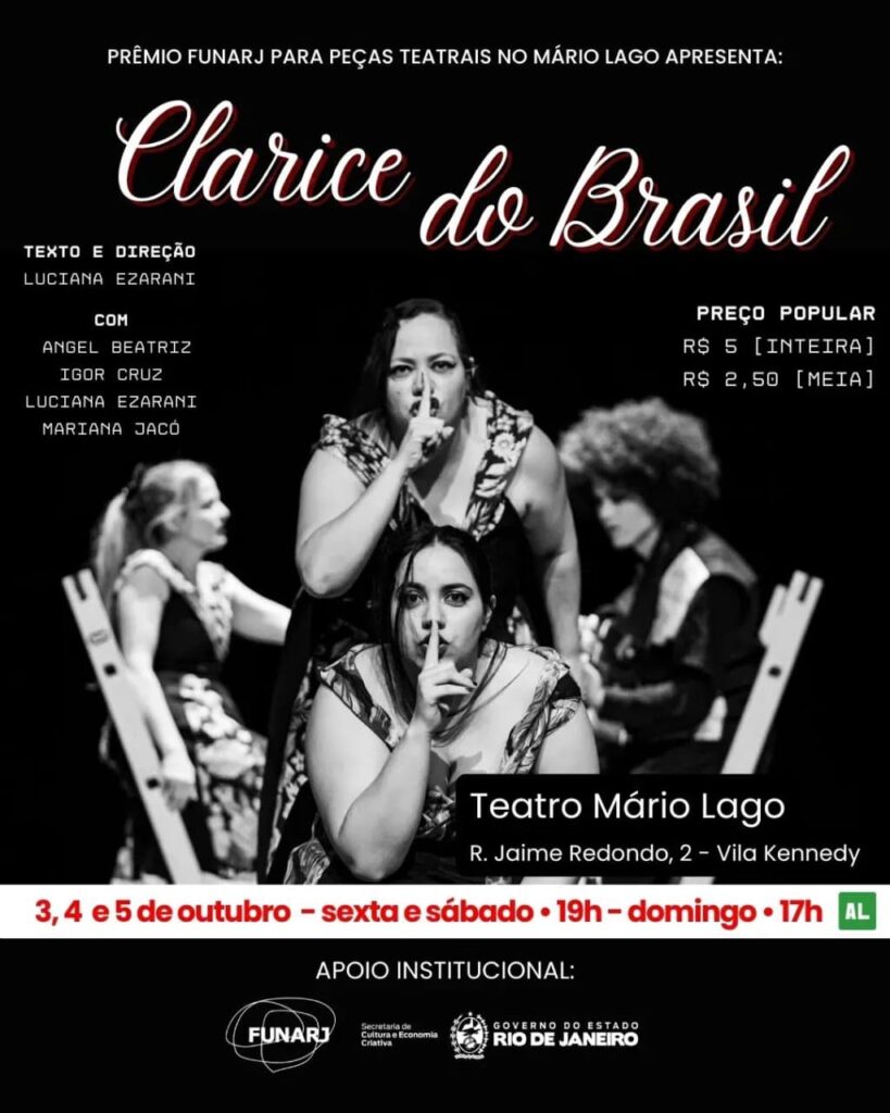 Explorando questões universais sobre o ser humano e o protagonismo feminino, o premiado espetáculo Clarice do Brasil homenageia a escritora Clarice Lispector em uma montagem autoral que mescla biografia e obra literária. Com texto e direção de Luciana Ezarani, a peça traz ao palco três atrizes e um ator, revelando a complexidade das personagens femininas de Clarice e o papel da mulher artista em um mundo historicamente masculino.
