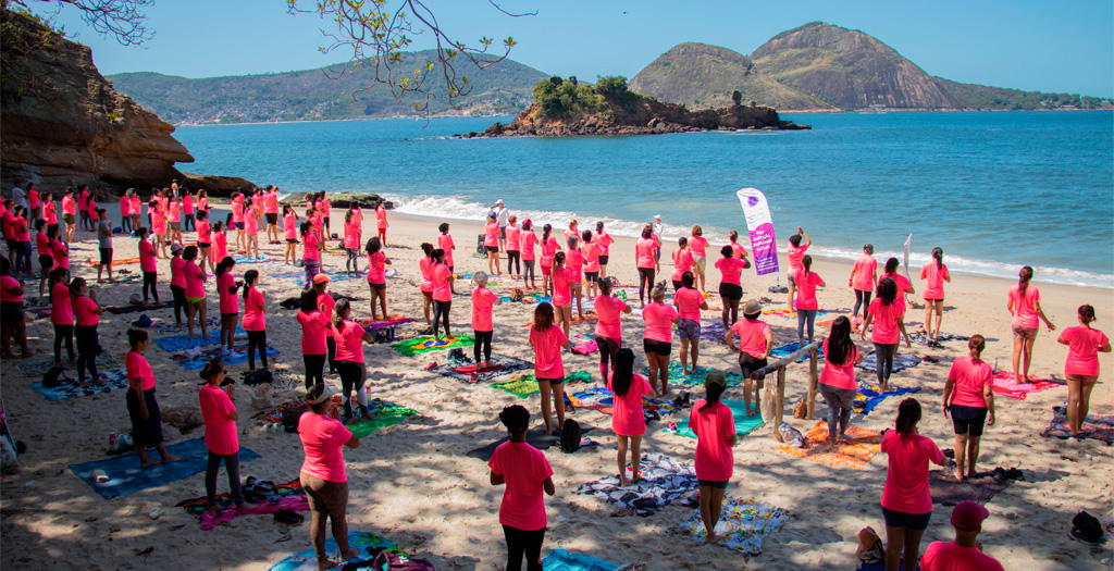 Rio (RJ) – O projeto Yoga na Praia, realizado nesse domingo (06/10), na praia de Boa Viagem, Zona Sul de Niterói, região metropolitana do Rio, marcou a abertura da 8ª edição do Outubro Rosa, promovido pelas clínicas Pró-Onco Mulher e Oncomed. Cerca de 150 pessoas (a maioria mulheres) participaram do aulão conduzido pelos professores Jorge Carrano e Cristiane Garcia, do Estúdio Dharma Bhumi, que distribuiu aos alunos camisas rosa choque, cor da campanha mundial que alerta sobre os riscos e prevenção ao câncer de mama.